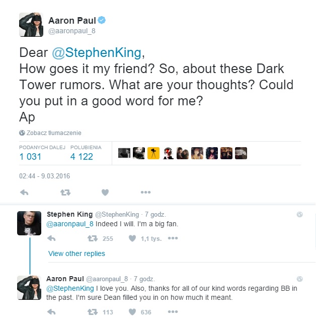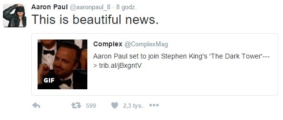 Wczoraj pojawił się nowy viral - odświeżona przez portal Blastr plotka jakoby Aaron Paul miał zostać zaangażowany do roli Eddie Dean'a do filmu Nikolai Arcela "Mroczna Wieża".