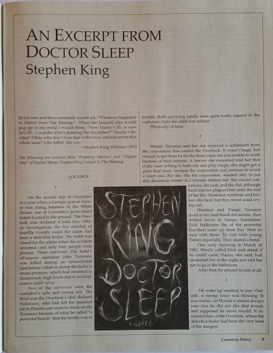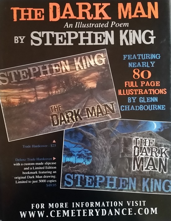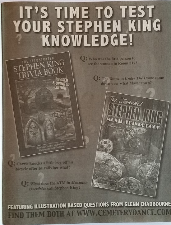 Ponadto pełnostronicowe reklamy "Doctor Sleep" od Scribnera i trzech pozycji od Cemetery Dance: "The Dark Man", "The Illustrated Stephen King Trivia Book" i "The Illustrated Stephen King Movie Trivia Book".