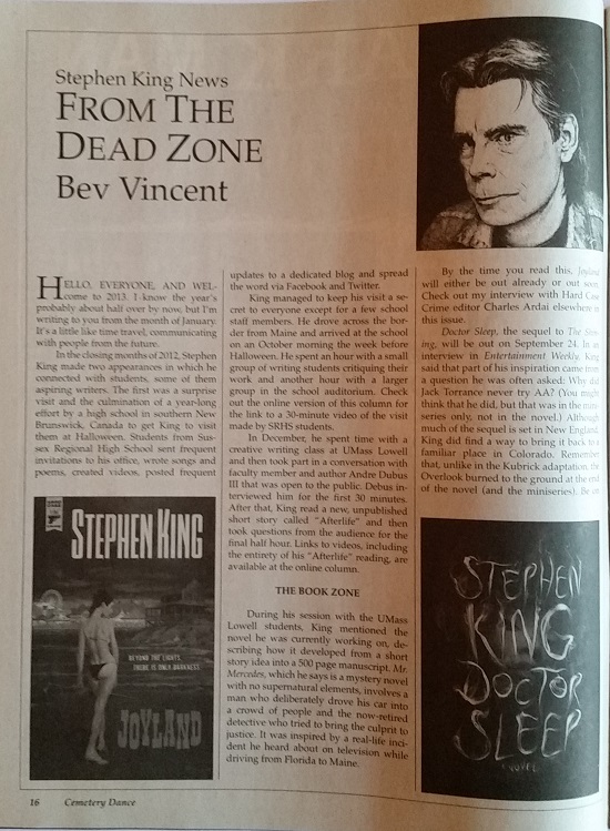 Ponadto jak zwykle obszerna kolumna Beva Vincenta "Stephen King News from the Dead Zone" i masa informacji o "Joyland" (również o wydaniu limitowanym), premierze "Doctor Sleep", "The Shining" w wersji limitowanej od Subterranean Press i oczywiście serialu "Under the Dome" ("Pod kopułą") i filmie "Carrie". Znajdziemy też kilka przykrych informacji: m. in. przyczynach rezygnacji Jonathana Demme z fotela reżysera "11/22/63" oraz odejściu Bena Afflecka z projektu ponownej ekranizacji "The Stand".