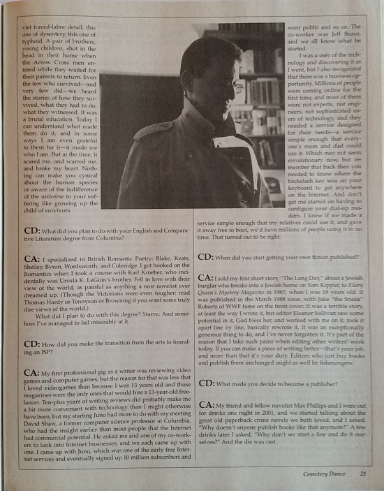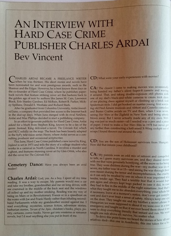 Na następnych stronach mamy ciekawy wywiad Vincenta z Charlesem Ardai, redaktorem serii Hard Case Crime, w której ukazały się "The Colorado Kid" oraz "Joyland". Panowie rozmawiają o Stephenie Kingu, jego twórczości, kryminałach i serialu "Haven".
