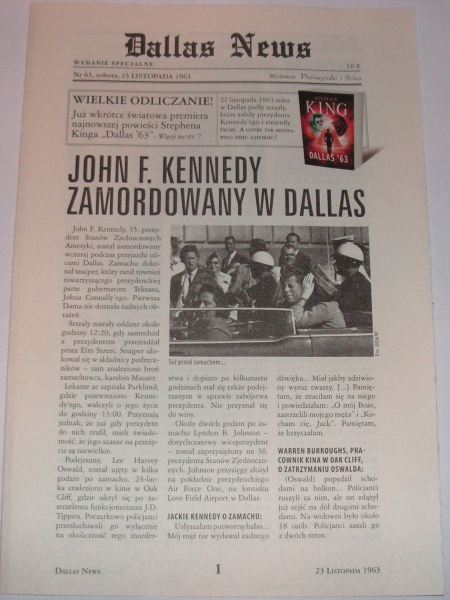 "Dallas News" nr 23 listopada 1963 (gazetka promocyjna)Jest to gazetka promocyjna przygotowana przez wydawnictwo Prószyński i S-ka z okazji premiery książki "Dallas '63".