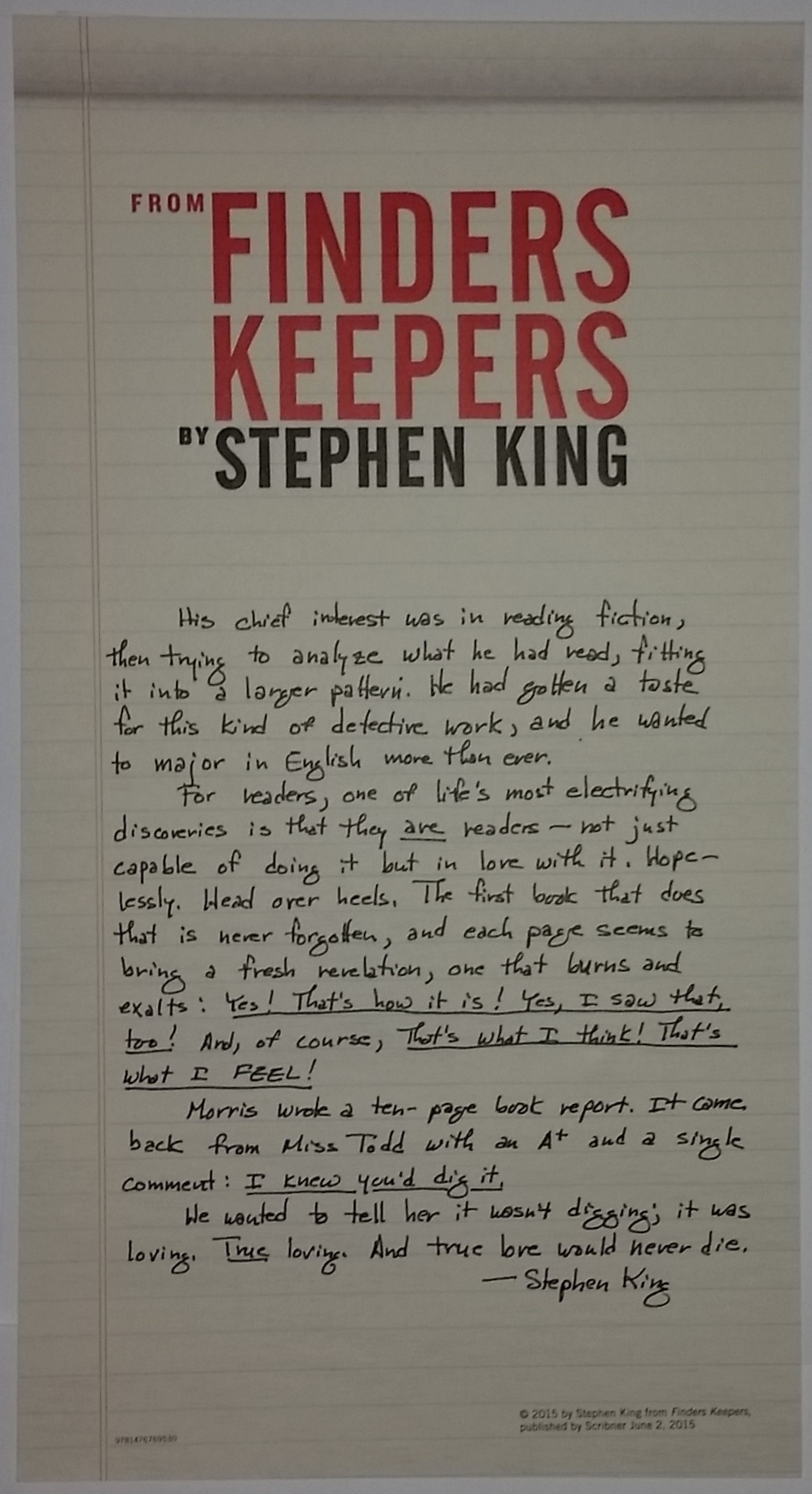 Ulotka miała zawierac kopię odręcznego tekstu napisanego i podpisanego przez Stephena Kinga.