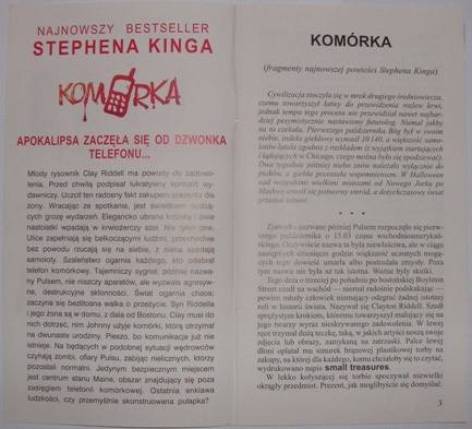 Ten 16 stronicowy zeszycik był dodatkiem do książki "Prędkość" Dean'a R. Koontz'a, a jednoczesnie częścią promocji najnowszej w tamtym czasie powieści Stephena Kinga - "Komórka".