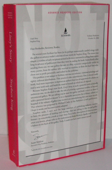 W tym przypadku na okładce wydrukowano list wydawnictwa, w którym wice prezes Scribnera, Susan Moldow, tłumaczy dlaczego przez ostatnie lata wydawnictwo nie drukowało kopii dla zaawansowanych czytelników (ARC). Głównym powodem było zjawisko handlu tego typu publikacjami jeszcze przed premierą samej książki, co w znaczny sposób osłabiało jej pozycje po premierze (bo od razu pojawiały się skany i wersje elektroniczne). Jednocześnie zaznacza, że ze względu na szczególny charakter tej powieści wydawnictwo postanowiło jeszcze raz dać szansę temu rodzajowi promocji.