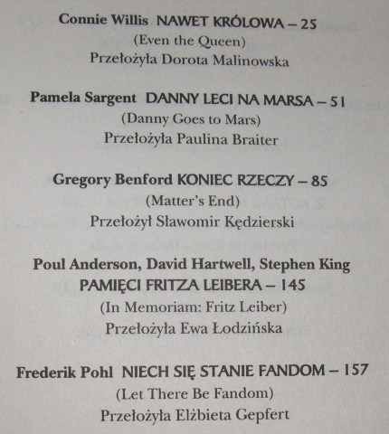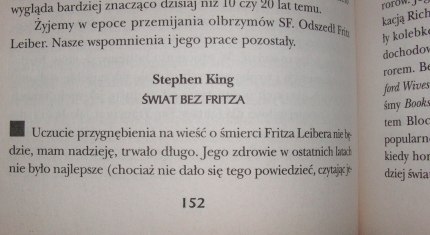 Antologia zadedykowana "Pamięci Fritza Leibera" zawiera krótki tekst Kinga zatytułowany "Świat bez Fritza".