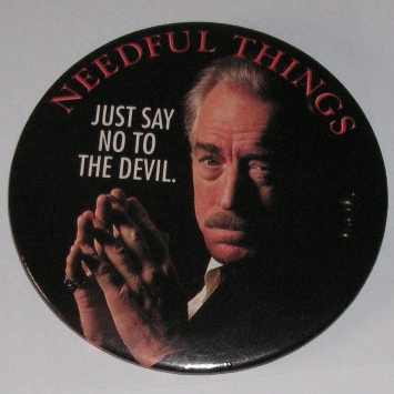 Okrągła przypinka promująca film "Needful things" ("Sprzedawca śmieci") o średnicy 7,5cm.