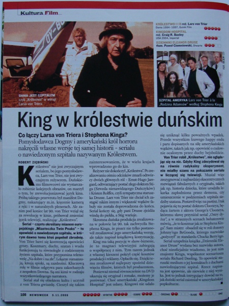 Tekst jest porównaniem dwóch seriali: "Królestwa" Larsa von Triera i "Szpitala Królestwo" Stephena Kinga, przy czym trzeba zauważyć, że autorowi udało się wyjść obronną ręką z typowego dla tego typu tekstów problemu - odpowiedzi na pytanie "który serial jest lepszy?". Ziębiński skupił się raczej na różnicach i elementach, które wyróżniają poszczególne wizje tej samej historii (chociaż razem z artykułem opublikowano gwiazdkową ocenę seriali). Dzięki temu, tekst jest ciekawy zarówno dla fanów Kinga jak i duńskiego reżysera.