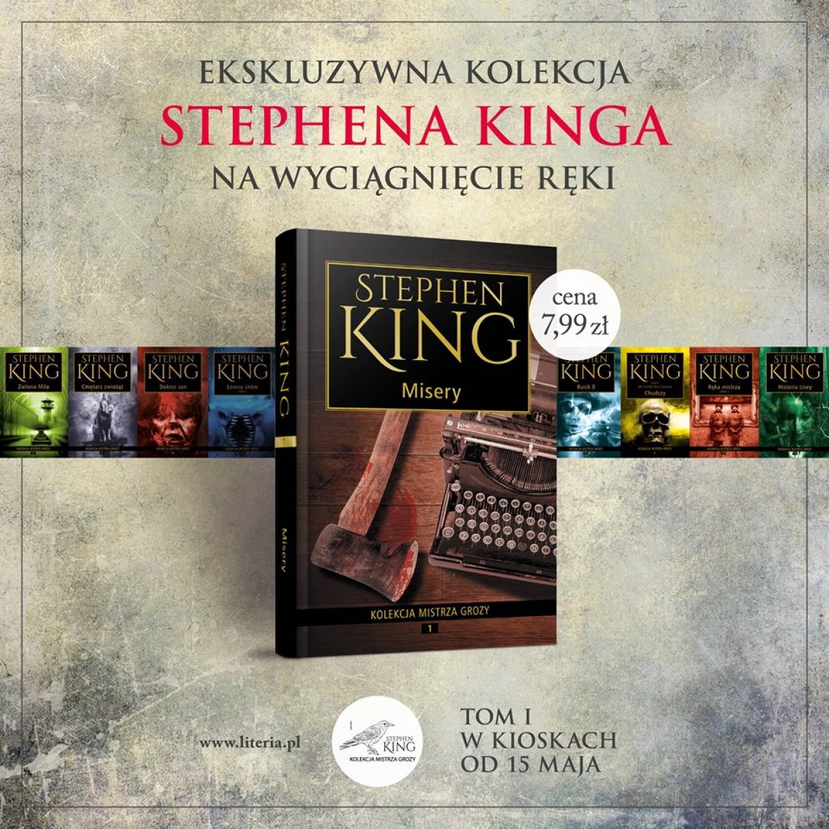 Wydawnictwo Albatros, Prószyński i S-ka oraz Ringier Axel Springer zapowiedziało kolekcję prasową książek Stephena Kinga pod nazwą "Kolekcja mistrza grozy"! Podobnie jak w przypadku innych tego typu kolekcji (serila książek Lee Childa czy Jacka Grishama), książki będą ukazywały się co 2 tygodnie. Pierwszą z nich będzie "Misery", która w promocyjnej cenie 7,99zł trafi do kiosków już 15 maja 2017. Kolejne tomy będą dostępne w cenie 16,99zł, a w prenumeracie 14,99 zł.