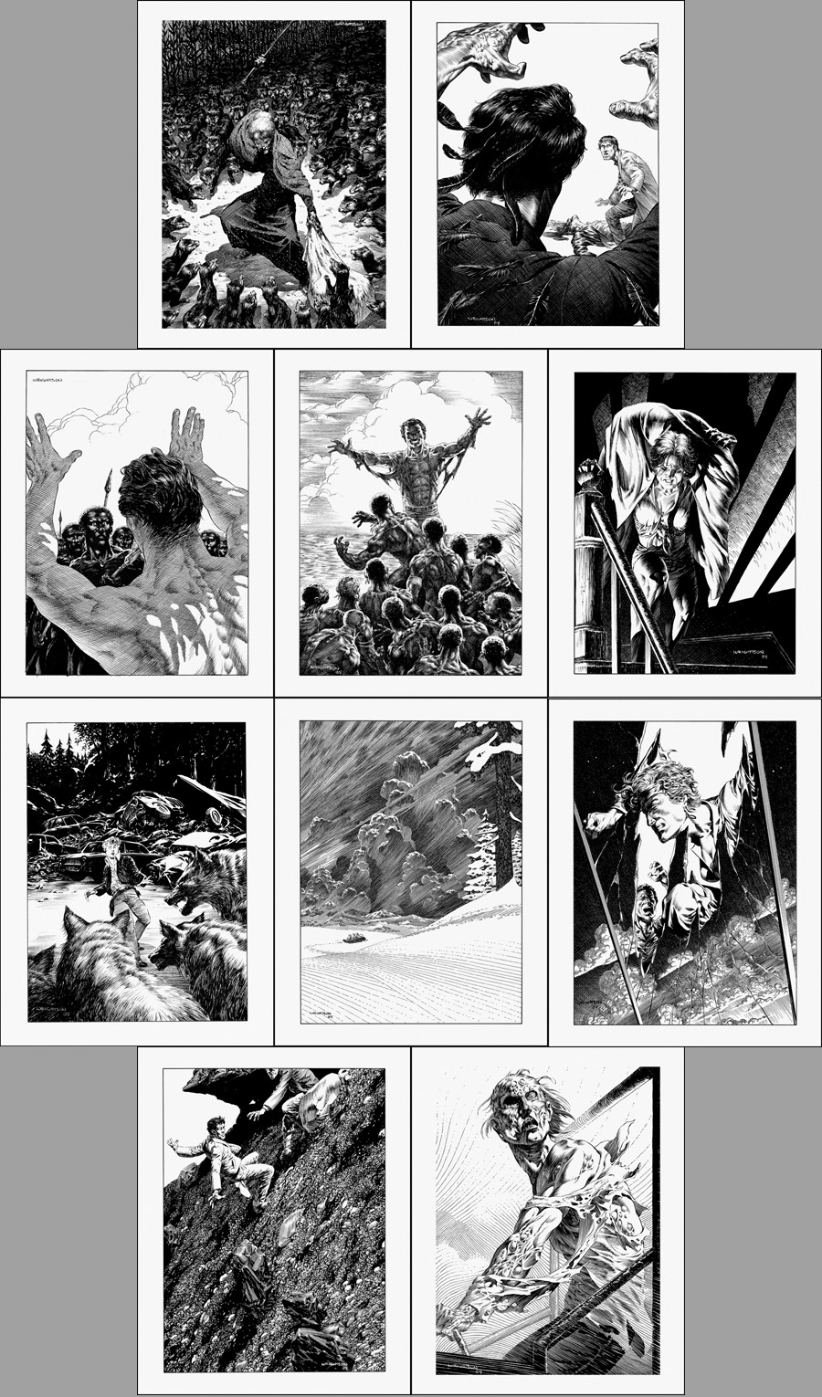 Dodatkowo, takie portfolio było już dostępne wcześniej wiele lat temu, w 1991 roku zostało wydane przez Glimmer Graphics (link do galerii w panelui po prawej stronie), a obecnie wartość rynkowa tej edycji limitowanej do 1200 egzemplarzy z jednym autografem artysty waha się od $110 do $150 (jednak folder tego wydania jest na pewno brzydszy). Co ciekawsze - poprzednie portfolio zawierało 12 grafik, ale za to w nowym portfolio znalazła się jedna grafika, której nie było w wydaniu z 1991 roku (Randall Flagg stojący tyłem do kadru z uniesionymi dłońmi przed tłumem ludzi - co obrazuje scenę z epilogu). Ilustracja ta nie znalazła się w książce.