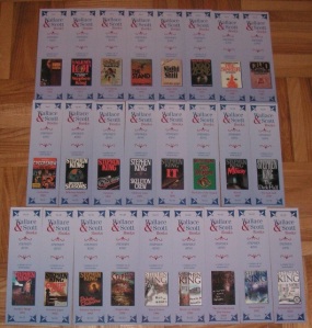 Najbardziej obszerny zestaw zakładek w mojej kolekcji: 25 zakładek wykonanych na zamówienie firmy "Wallace & Scott". Zakładki te ozdobione są okładkami pierwszych amerykański wydań książek Kinga oraz krótkimi opisami książek.